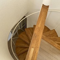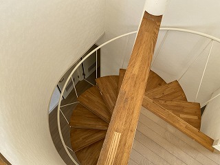 玄関を入るとすぐに螺旋階段が目に飛び込んできます。通常、階段のあるスペースは日差しが遮られて暗くなりがちですが、この螺旋階段はオープンなので、目線もその先に届きますし、2階からの明るい日差しも1階に届いて、とても解放感が感じられます。