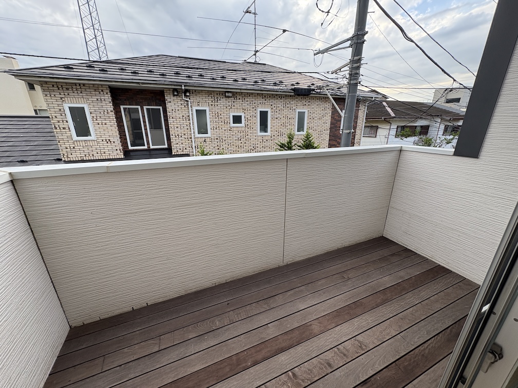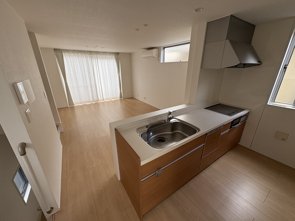 2階のLDKは約17帖の広さがあり、南向きの大きな窓から明るい陽射しがたっぷり差し込みます。キッチンは対面式のカウンターキッチンで、IHクッキングヒーターや食器洗浄乾燥機も備えた使い勝手の良いシステムキッチンです。家族がくつろぐリビングダイニングを見渡しながら料理ができ、会話も弾む開放的な空間となっています。リビングに面してワイドバルコニーとウッドデッキも設置されており、天気の良い日にはバルコニーでひなたぼっこをしたり、夕暮れ時にはデッキで涼みながら茜色に染まる空を眺めたりと、室内にいながらにして外の開放感を満喫できます。