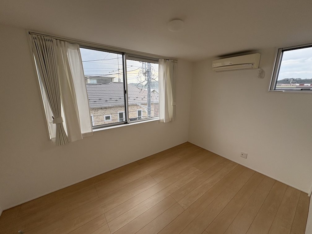 3階は寝室フロアになります。下の階から離れたプライベート空間で、家族それぞれが静かに休める造りです。主寝室には大きなウォークインクローゼットがあり、衣類や荷物もしっかり収納できます。そのほか全居室に収納スペースが備わっているため、荷物が多い方でも室内をすっきりと保てます。そして窓からはわずかですが、海が見ることができます。快適な睡眠を誘う静かな環境で、一日の疲れをゆっくり癒やすことができるでしょう。