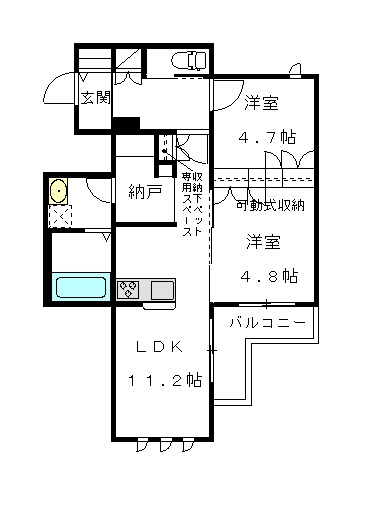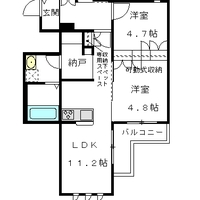 洋室が2部屋(約4.7帖と4.8帖)、リビングダイニングキッチンは11帖超あり、二人暮らしや小さなご家族にも十分な広さです。さらに納戸(サービスルーム)が1つ付いているため、在宅ワークの書斎や大きな荷物の収納スペースなど多目的に活用できます。全居室フローリング仕上げで掃除もしやすく、主寝室にはウォークインクローゼットも備わっているため荷物が多い方も安心です。