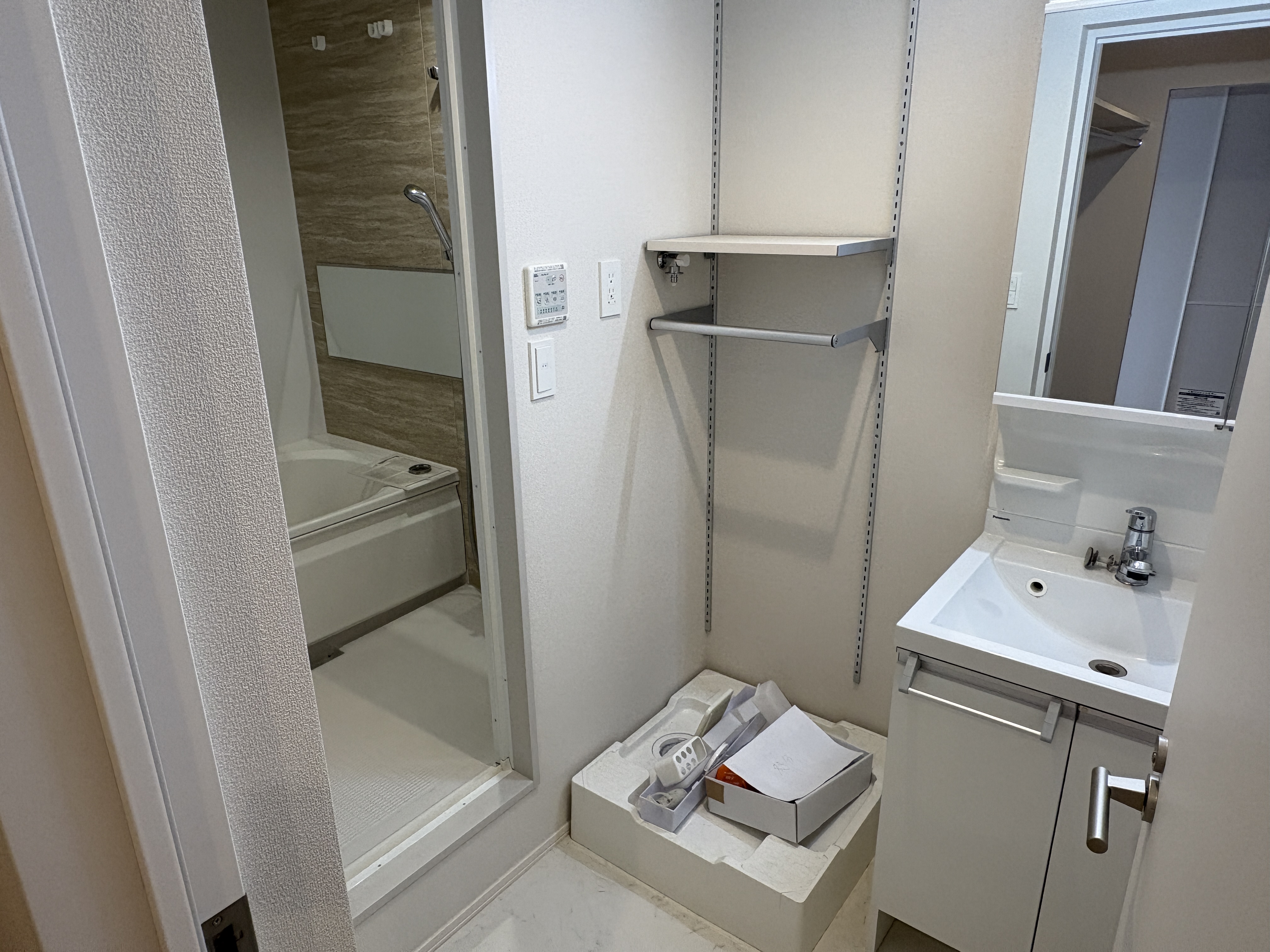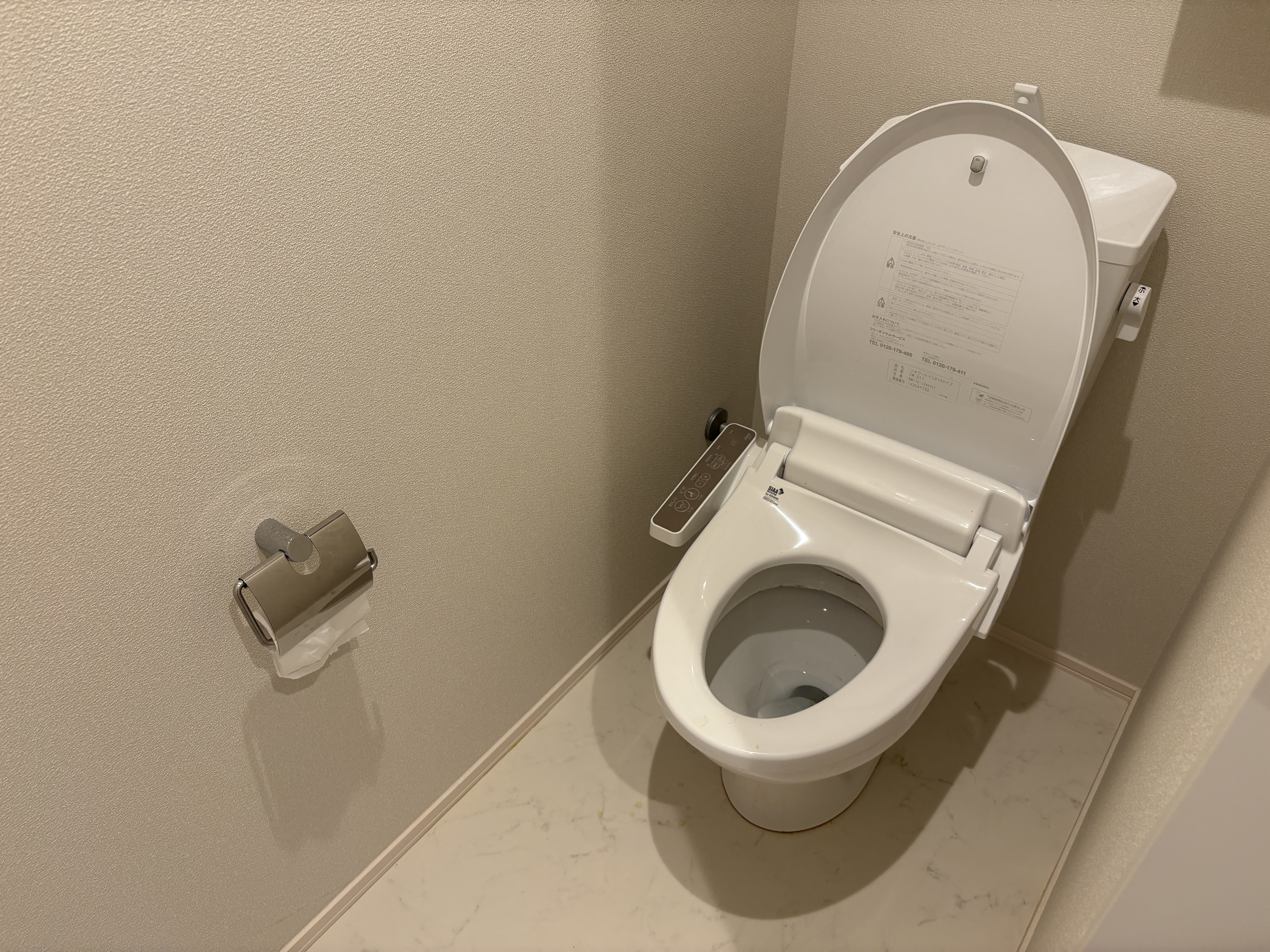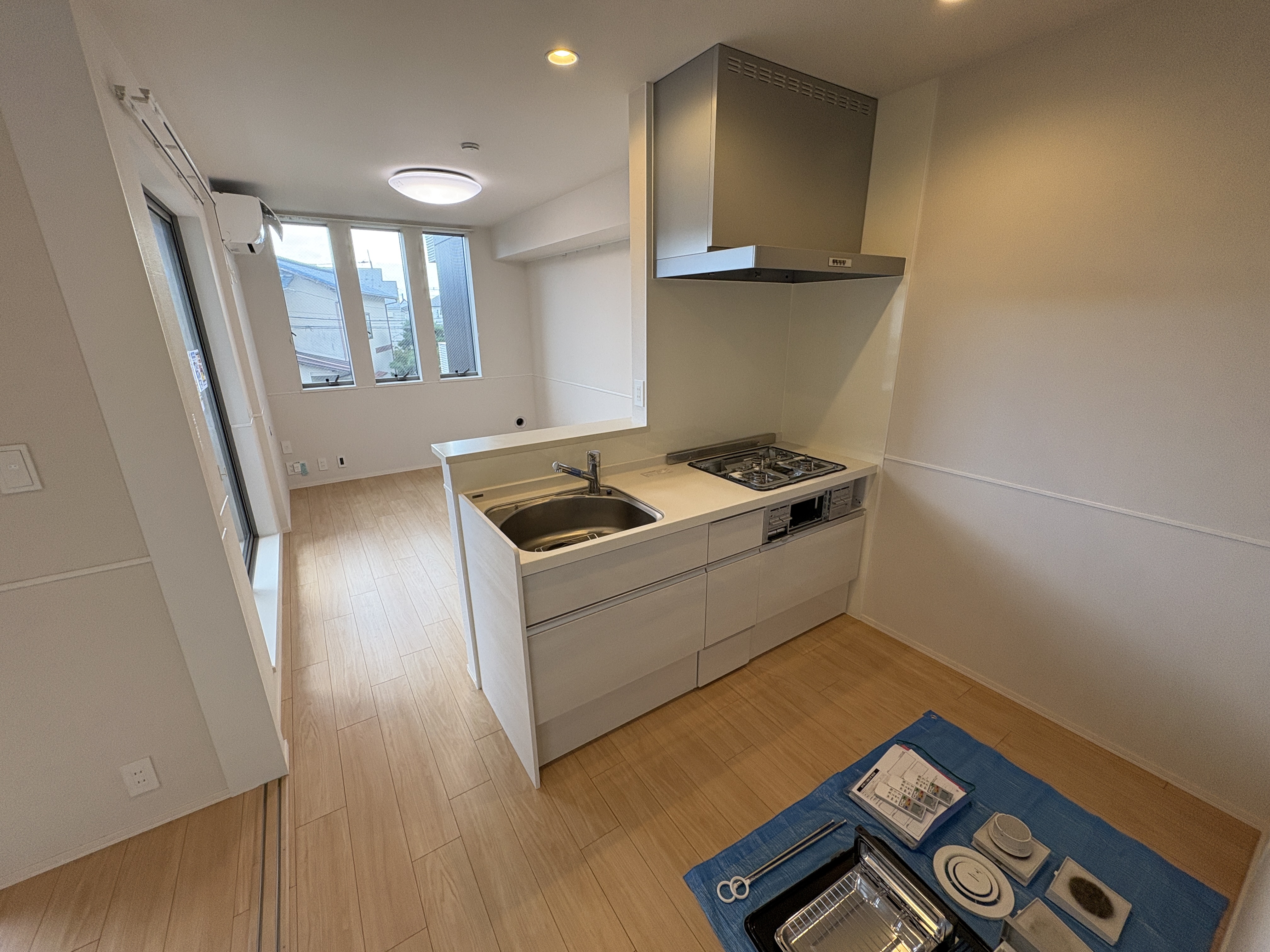 設備面も新築ならではの充実ぶりです。対面式カウンターキッチンには3口コンロ+グリルが付いており、本格的な料理を楽しみたい方に嬉しい仕様。お風呂は追い焚き機能付きでいつでもぽかぽか、浴室乾燥機も完備しているので雨の日の洗濯も安心です。独立洗面台や温水洗浄便座など水回りの設備も充実しています。エアコンはリビング等に計2台設置済みで、夏も冬も快適に過ごせます。さらにインターネット使用料無料なので、入居後すぐにテレワーク環境が整うのも嬉しいポイントです。
