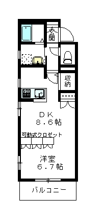 間取りは1DK(DK8.6帖+洋室6.7帖)。可動式のクローゼットで仕切られており、レイアウトを変えることでお部屋の雰囲気を自由に演出できます。ペット専用設計のマンションだけあって、機能面も充実しております。お部屋にはペット専用トイレスペースや小さな出入口ドアが設けられており、来客時にもスマートに対応できます。さらに全居室にエアコンを完備し、フローリングは掃除がしやすく清潔感のある空間になります。浴室乾燥機や追い焚き機能付きバス、システムキッチンなど水回りも最新設備が揃っています。