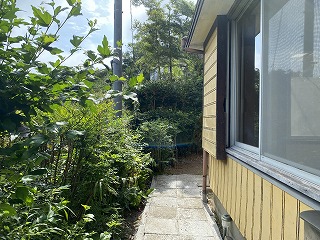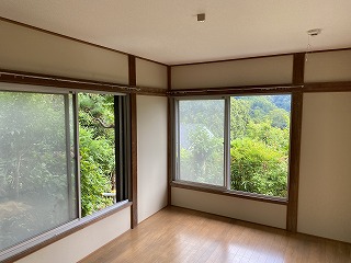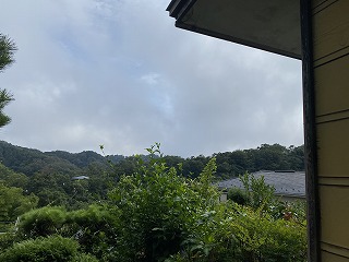 上の写真は庭から見える景色です。1階のお部屋ですが、高台にあるので、遠くには鎌倉の山々を臨むことができます。