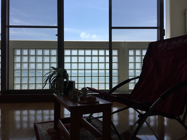 お部屋の間取図を見ていただいてお分かりの通り、玄関を開けたらすぐに洗面・浴室があるんです。サーフィンで濡れた体でもすぐに浴室に行って、さっぱりすることができます。そして、体を動かして疲れた体をベランダの椅子にゆだねて海を見ながら冷たいビール!!何とも贅沢なひとときですね。