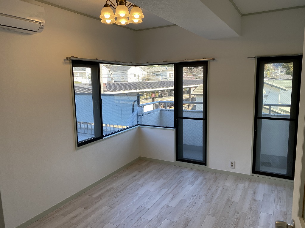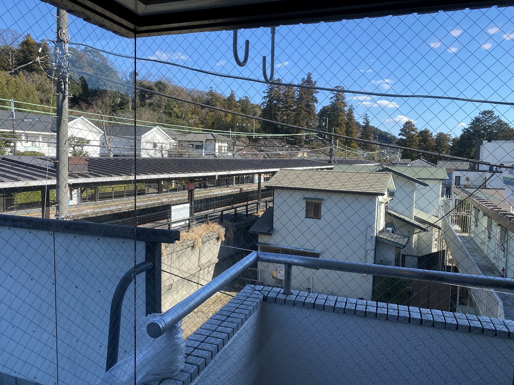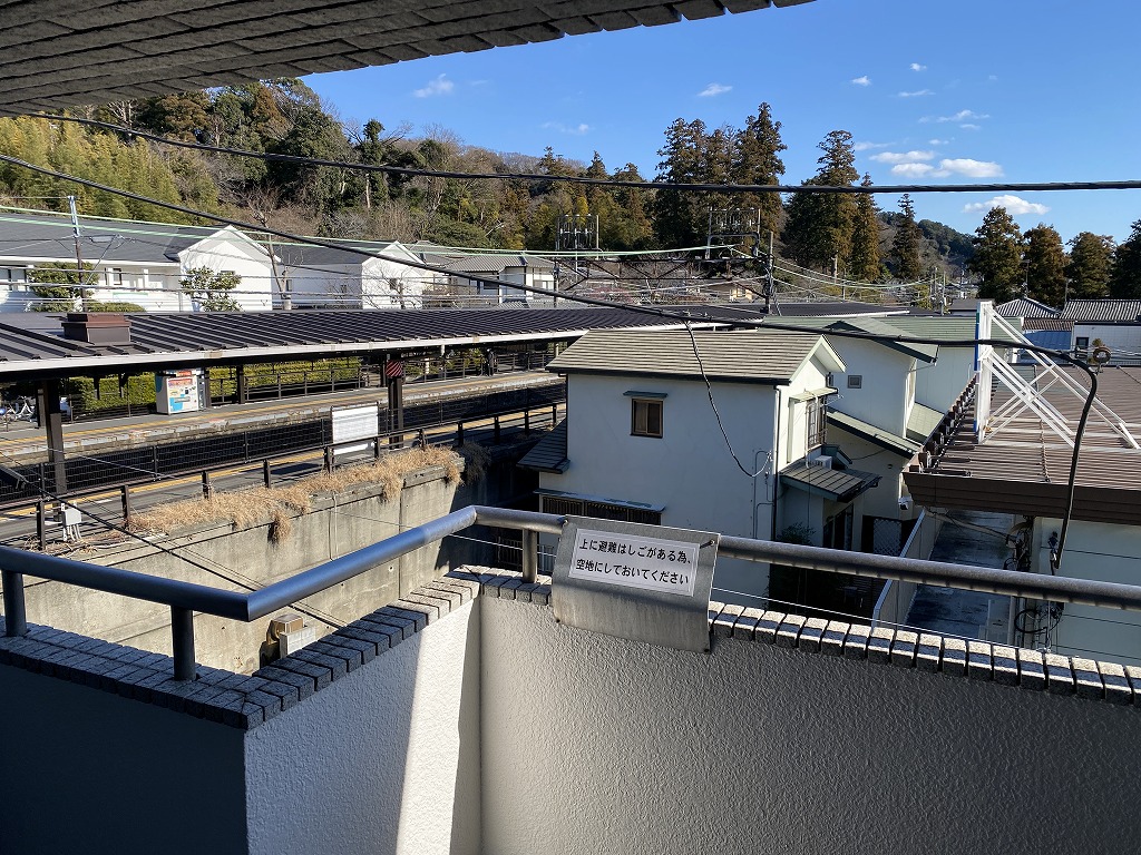 北東側のバルコニーからの景色からは円覚寺の山や源氏山方面の山の緑を楽しむことができます。この建物は鎌倉街道に面していますが、この部屋は、道路とは反対側にある部屋ですので、道路の車が通る音はあまり聞こえませんが、すぐ近くに北鎌倉駅のホームがあって、電車の音は聞こえます。ただし、ホームの近くなので電車が北鎌倉駅に来る電車は減速して入ってきますし、北鎌倉駅を発車する電車はまだ速度が出ていないので、それほど大きい音は出ないのです。秋には紅葉、春は桜と、季節を感じられて、好きな方はいつまででも窓辺に座って眺めていられそうです。