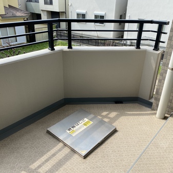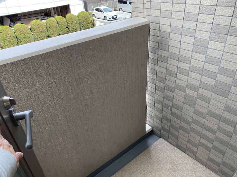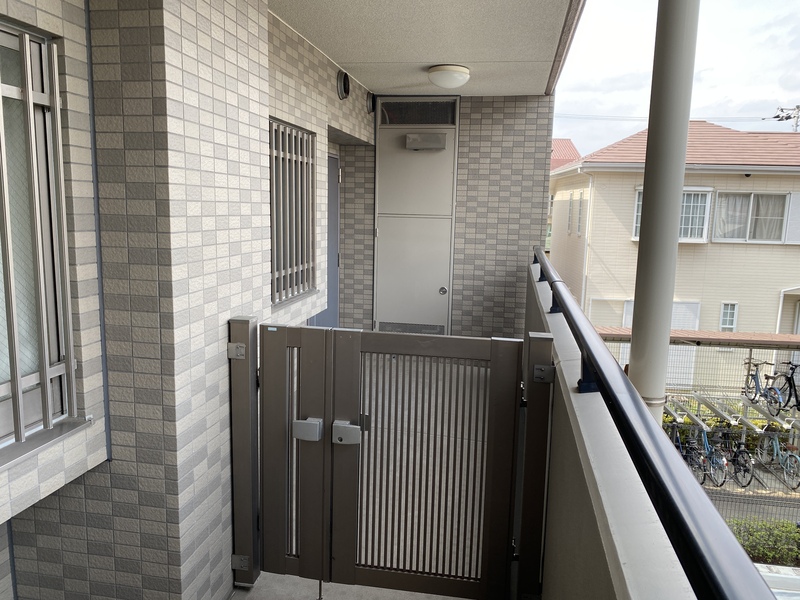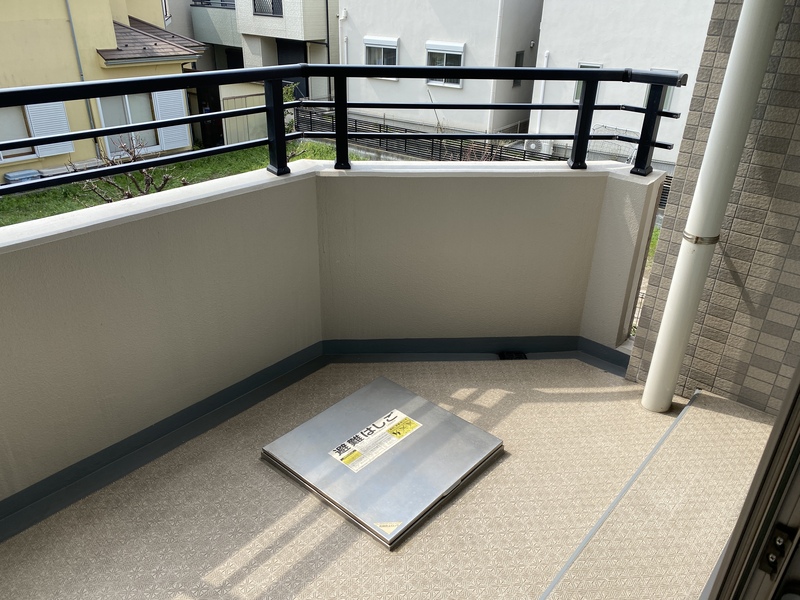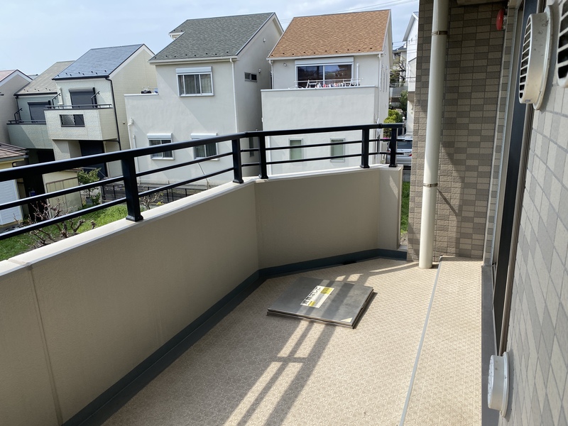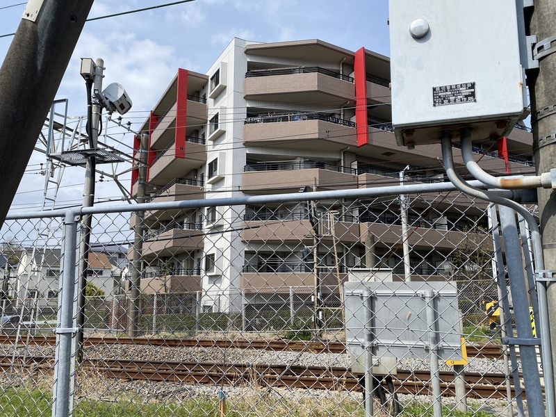 また、今回販売しているお部屋(302号室)は下の写真の赤い四角印の部分にあるお部屋でで、このマンション内では線路からは離れた場所に位置しています。下の写真をご覧いただけましたらお分かりの通り、ベランダの前には駐車場のスペースがあり、その先に線路があるので、目の前に高い建築物などがなく、視界が開けて開放的ですし、明るいのです。