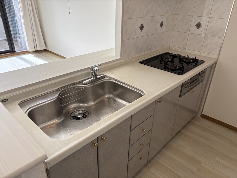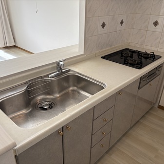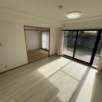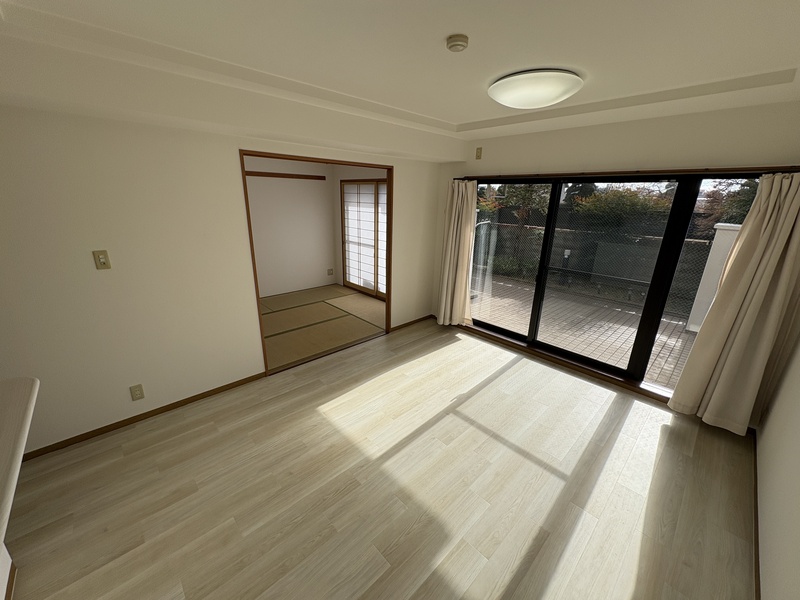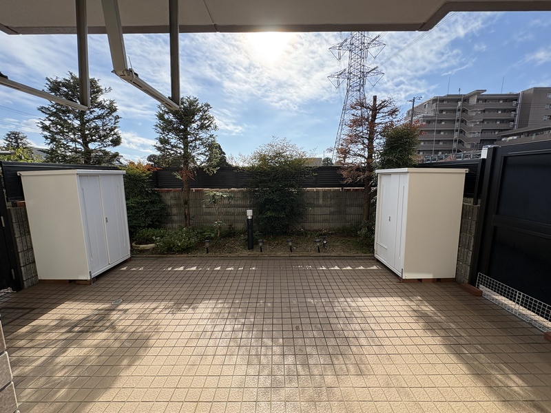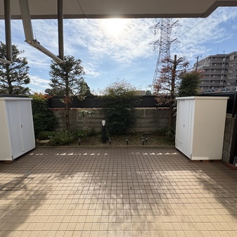 本住戸は22.2㎡のテラスを備えた1階住戸です。テラス使用料は不要で、洗濯物を干すスペースとしてはもちろん、鉢植えを並べたり、外の空気を感じながら過ごしたりと、住まいの一部として無理なく活用できます。さらに、住戸前には約10.6㎡の緑地スペースがあり、こちらも使用料はかかりません。室内からふと目を向けた先に緑が広がる、ゆとりある暮らしが実現します。キッチンやリビングからは、隣接地に広がる植木畑を望むことができ、視界が抜けた開放感のある景観が広がります。建物が迫らないため、1階でありながら圧迫感を感じにくい点も特徴です。