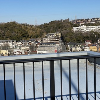 下の写真はルーフバルコニーからの景色ですが、緑色の枠は湘南記念病院(徒歩6分)、赤色の枠は相鉄ローゼン(徒歩3分)です。
